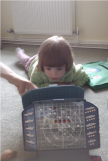The idea is that young children come to realise that, once they've uncovered the first square, they can find the rest pretty quickly by making a line. Furthermore, they may be able to work out where the line might go by looking at the darkened squares they've already clicked on. In the case of my daughter, this knowledge was by no means automatic, which is why this game exists - so she could practice the rudiments of the logic part of the game on a smaller game grid & on with a single boat.
